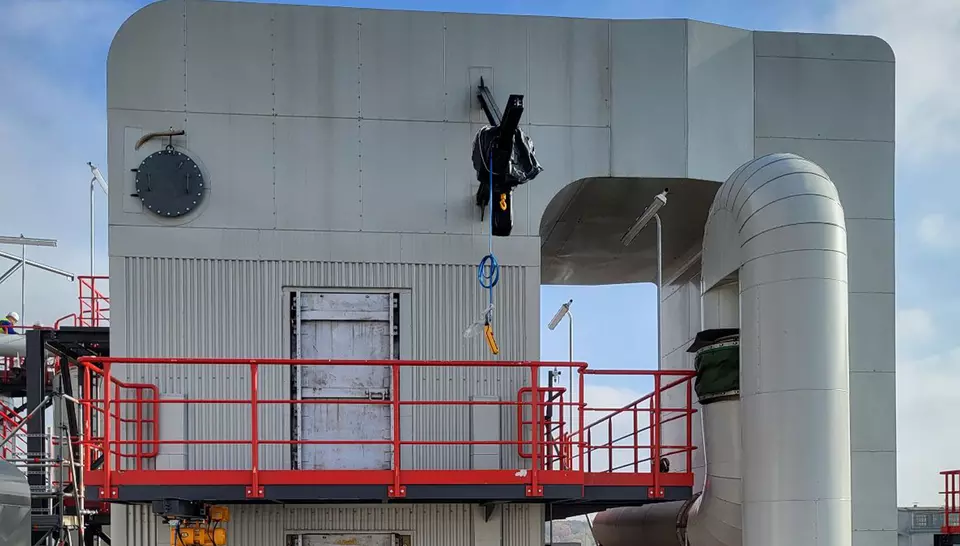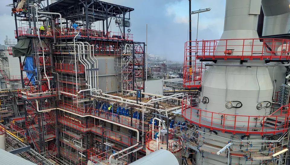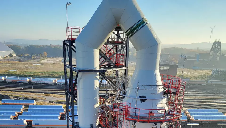 👉 Für eine optimale Funktion ist eine Rauchgastemperatur von > 220 °C erforderlich. Da die Einlasstemperatur 183 °C beträgt, ist eine Aufwärmung notwendig. Eine Teilmenge wird dem Rauchgasstrom entnommen, mit einem Erdgasbrenner auf 450 °C erhitzt und dem Rauchgasstrom wieder zugeführt. Die Rauchgase werden von Stickoxiden befreit.